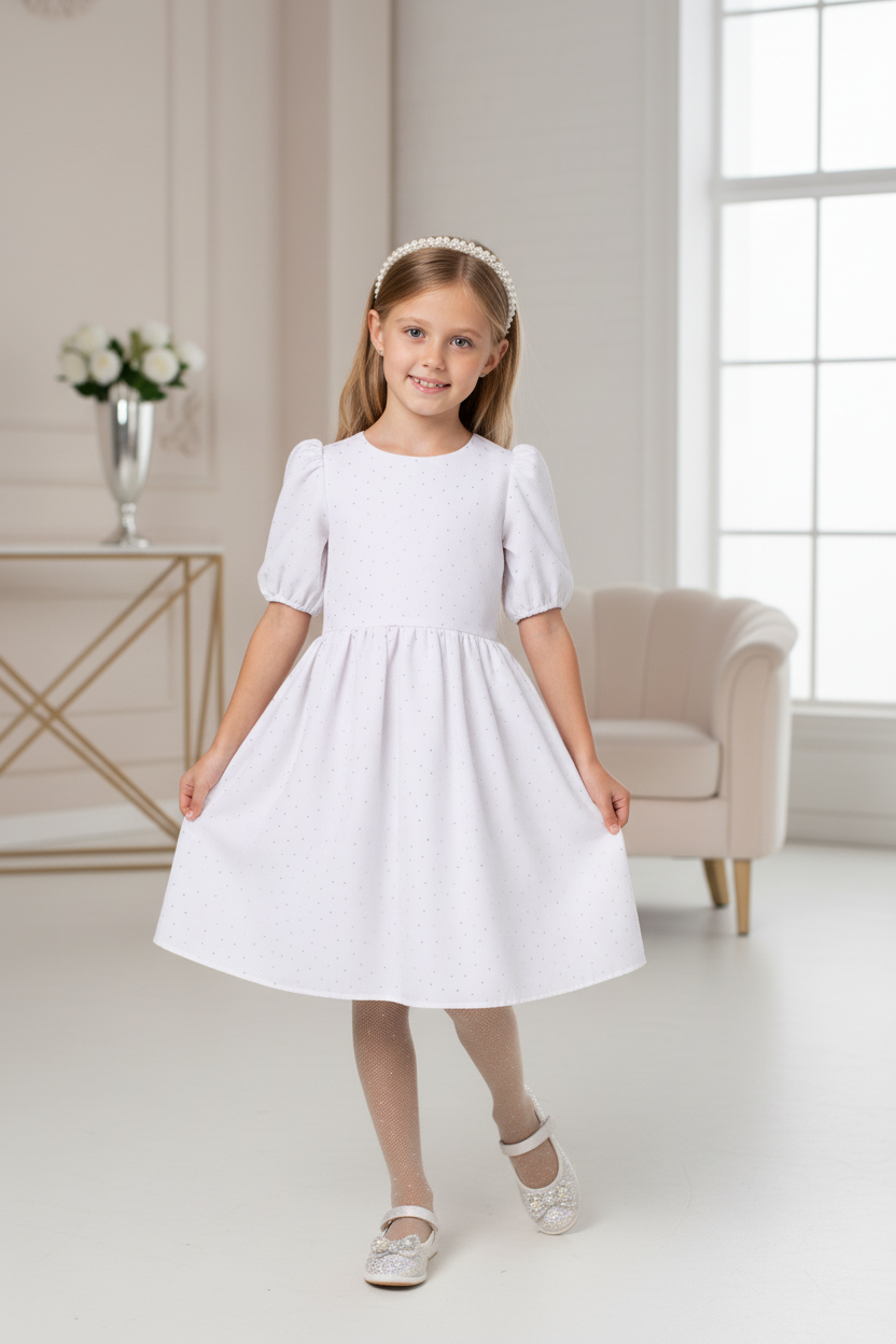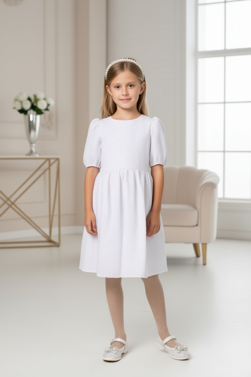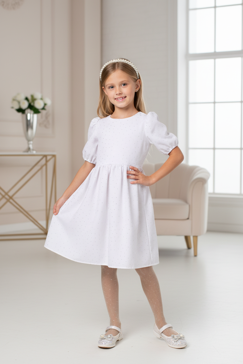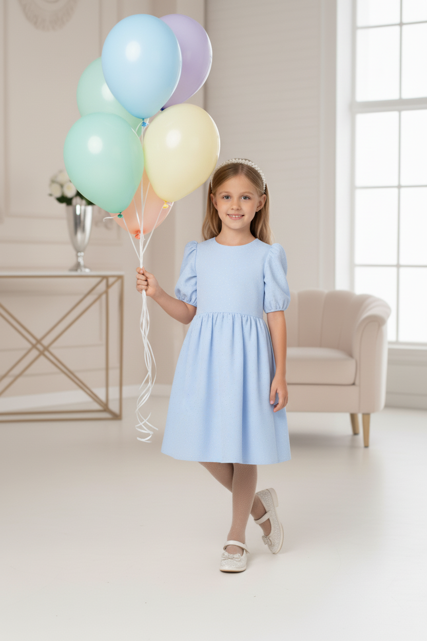 Праздничное, нарядное детское платье от бренда L&K очень нежное, стильное и невесомое. Милое платье в стиле “принцессы” декорировано блестящими стразами. Популярная классическая модель с закрытой спиной, со свободным кроем, длинное и приталенное придется по вкусу любой моднице. Платье полностью выполнено из хлопка, по объему регулируется отлетным поясом. Объемные рукава буфы – дополнительное украшение данной модели.